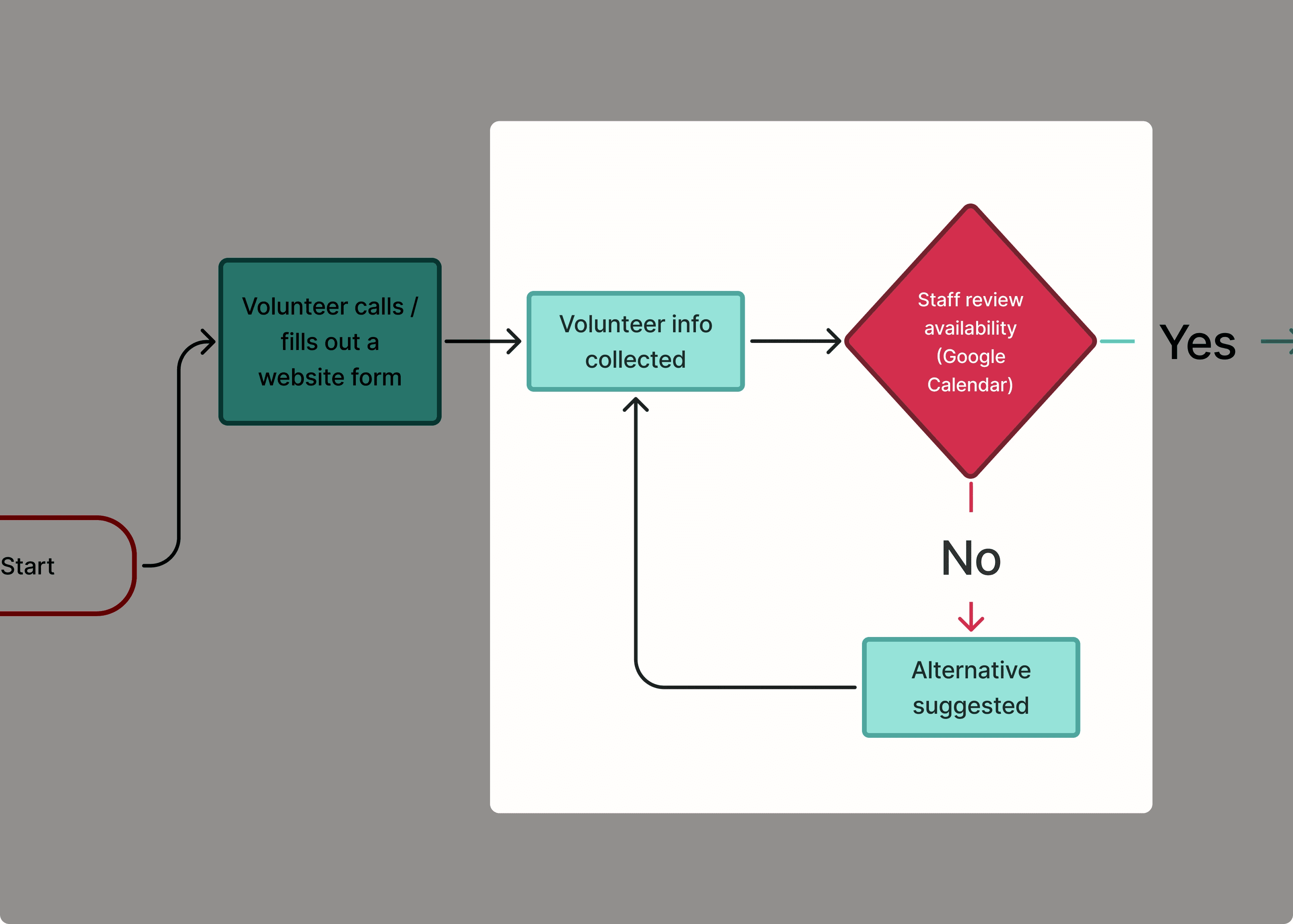 To understand how volunteer coordination currently works and where breakdowns occur, I initiated stakeholder interviews with operations and fundraising staff, reviewed existing tools, and mapped the end-to-end volunteer-staff workflow.