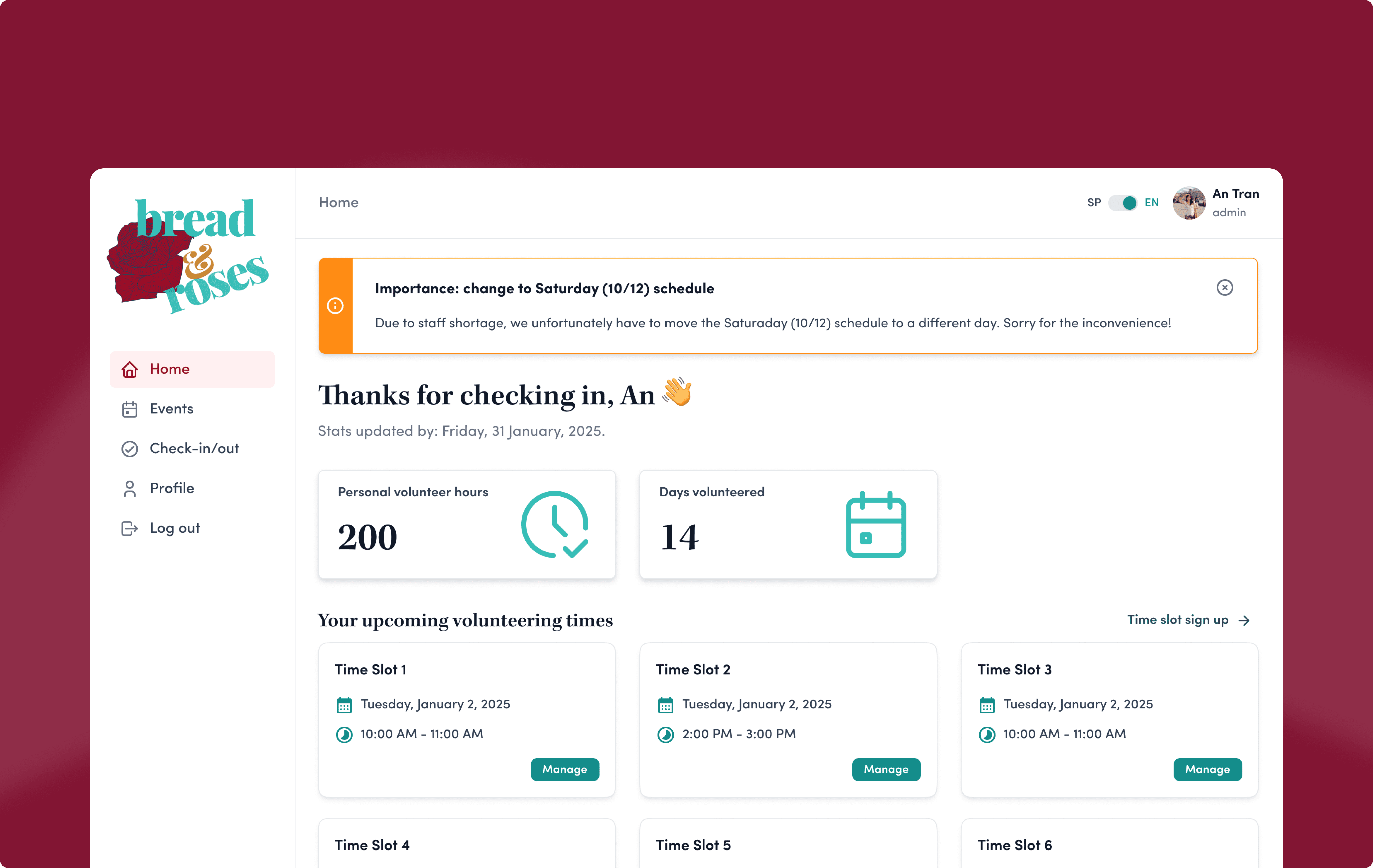 A centralized system that streamlines time-slot scheduling for both volunteers and admins, while enabling admins to mass-communicate schedule changes.